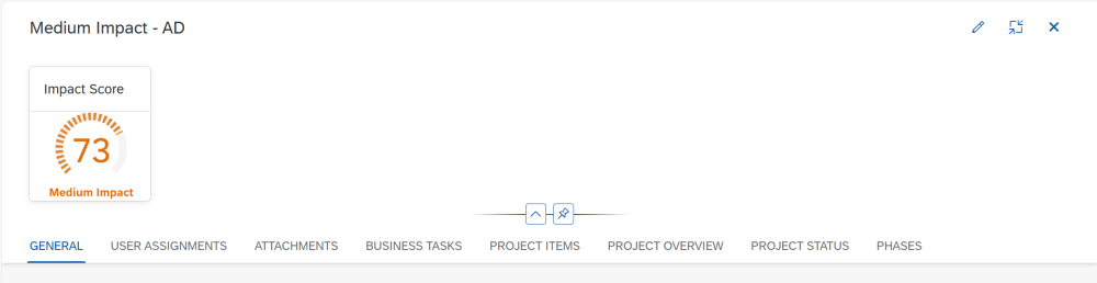Figure AC16-1: ActiveDiscover impact assessment score as a gauge chart on the header section of a Business Task