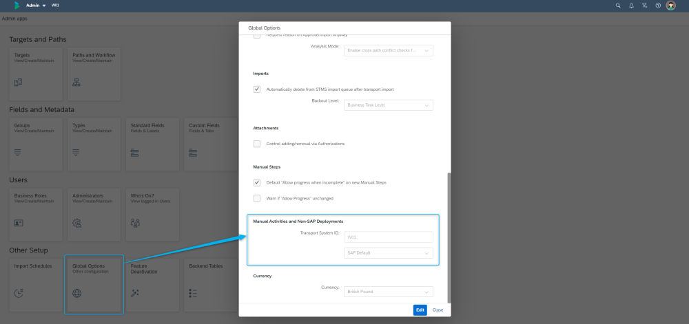 In order to support these new change types a dummy transport will be created in a nominated SAP system, as configured on the Global Options configuration screen.