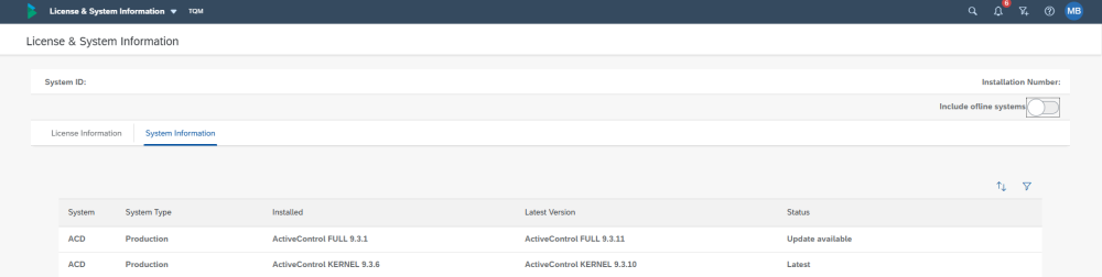 System information tab provides clear details of all configured systems within a customer the environment the current installation and the latest version of the installed product. The status value clearly visualises if the system is up to date or is and update is available.