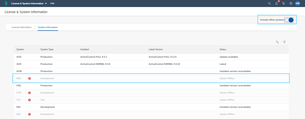 | Include Offline Systems (toggle) | Enables the visualisation of offline system in the table. |