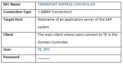 | 3.1.9 | Create TE Batch job user | Using SU01, create a TE Batch job user (suggested username TE_BATCH) for use in all background jobs. The First and Last names should be ‘Transport’ and ‘Express’ so it’s easy for users to see where notification emails have come from. Add the following Transport Expresso roles (within the TE Domain Controller): /BTI/TE:CTS_ADMIN_USER /BTI/TE:CTS_RFC /BTI/TE:COMP_ADMIN_ROLE |