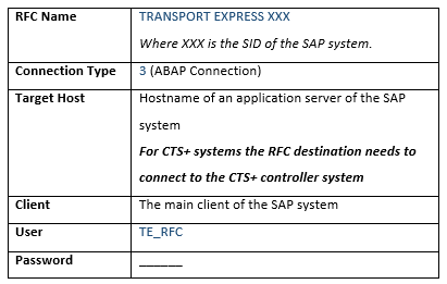 | 3.1.3 | Create RFC users | Use SU01 to create a TE_RFC user in all clients of all SAP systems, including the TE Domain Controller. This RFC user needs the following TE role assignments: SAP_BC_TRANSPORT_ADMINISTRATOR /BTI/TE:CTS_RFC For all remote systems the TE_RFC user needs to be of type System User For the Domain Controller systems the TE_RFC user needs to be of type Service User Important: In the Domain Controller, TE_RFC user also needs /BTI/TE:CTS_ADMIN_USER and /BTI/TE:CTS_ADMIN |