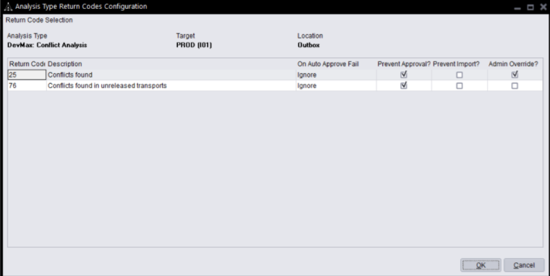 Prior to ActiveControl 7.1, only one Reason code existed within Approval & Import Prevention parameter of the 0005 DevMax: Conflict Analysis and 0035 Conflict Analysis checks, which essentially meant that it was possible only to prevent all merges where there were conflicts on both released and unreleased transports, or alternatively allow the Approvers to do an Approve Anyway in all situations.