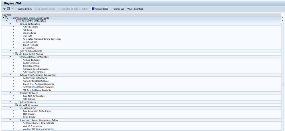 The SPRO menu is available via transaction SPRO (within SAP Reference IMG > BTI ActiveControl Configuration). Where relevant, the menu also includes documentation links back to our online Knowledge articles where relevant.