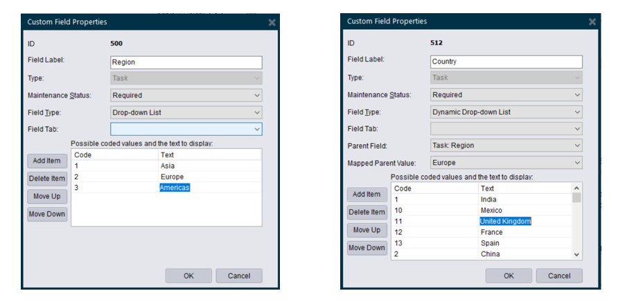 Figure: In this simple example, a Country ‘Dynamic Dropdown’ is linked to a parent source ‘Region’ dropdown field. Country values are linked to specific Region value