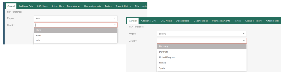Figure: As a result, the Country dropdown only shows the relevant values for the Region selected.