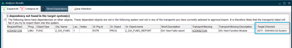 Since Transports might be deployed to difference cadencies within a “1:Many” type landscape – the Target information has now been added to the Analysis output as part of ActiveControl 8.50, so it is clearer what target SAP system the object is actually missing from.