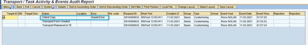 2. A new Event will be logged on the [Transport Status and History] tab in the Transport Form – “Error performing Client copy (SCC1)