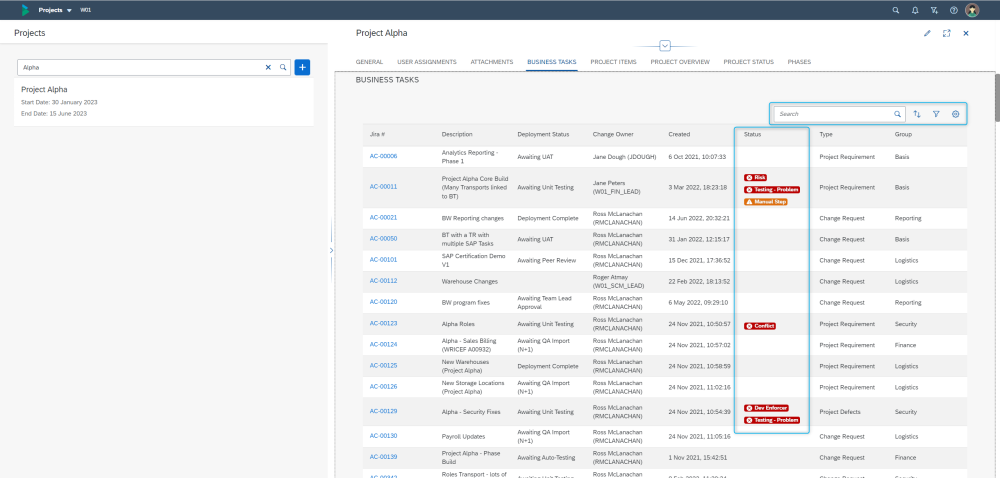 - The RAG Status column has been added to the subscreen, so that users can get a quick view of any issues relating to individual changes (ie Business Tasks) being delivered against the Project.