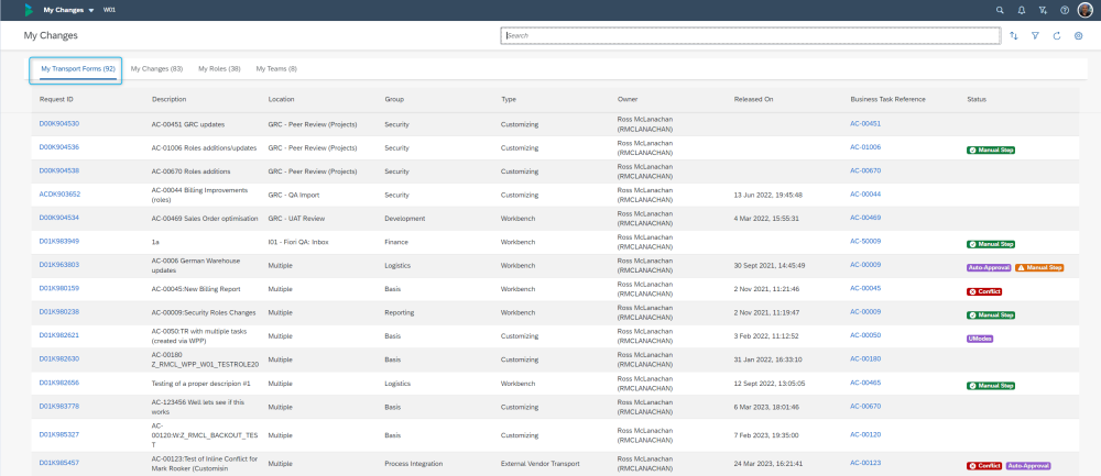 ActiveControl 9.10 introduces a new My Transport Forms list screen, whereby users that create SAP transports have a simple way of seeing all of their inflight Transport Forms.