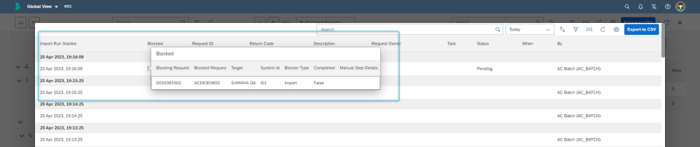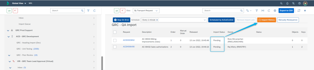Within the Web Platform, transports sitting in Import Queues will continue to show with “Pending” import status in the Global View, when they are being held up due to another transport or manual step. When this happens, the dependencies can be viewed via the Import History screen.