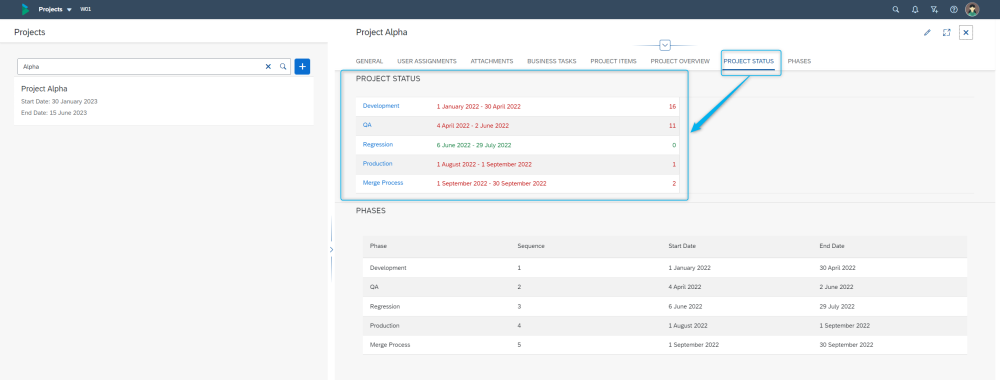 Figure: Project Status subscreen within the Project app.
