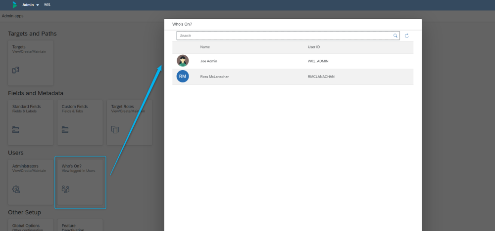 A similar screen is now available within the Web Platform via the ‘Who’s On’ app on the Admin screen. This screen shows all users that are logged into the Web Platform.