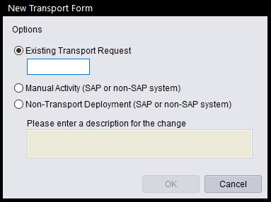 Transport Description: The text displayed next to the transport number is taken from the short description for the transport in SAP. Until the transport is released, any changes to this text will update the short description of the transport in the SAP system. This field is mandatory.