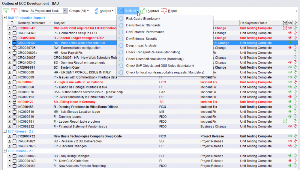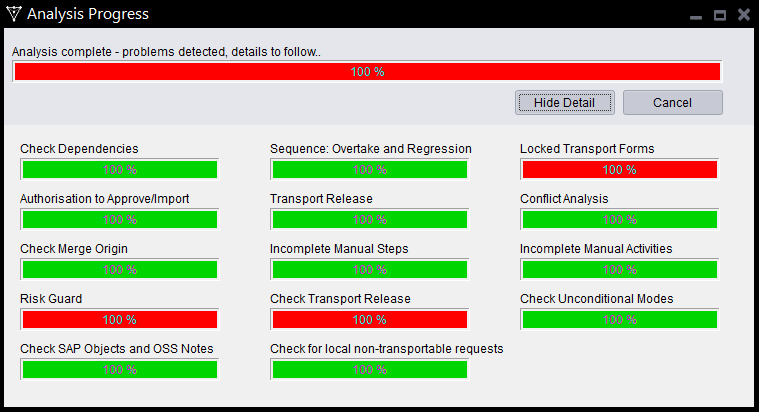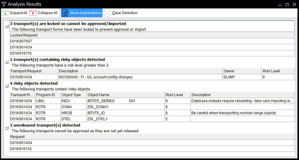 Prior to approval or import the tasks/transports can be analysed using the “Analyse” button. First highlight the items to be analysed or use CTRL-A to select all.