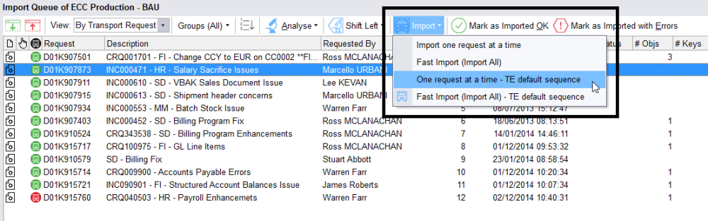 - One request at a time – TE default sequence: This imports the transports one by one in the TE calculated sequence even if the screen sequence is different. TE pre-sorts the transports prior to import