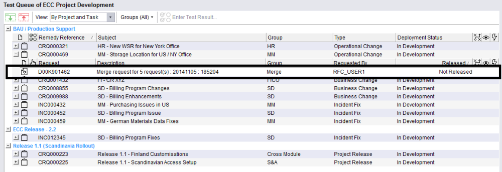 The Related Merge Requests tab in the transport forms shows either the related merge transport or, for the merge transport itself, it shows the original source transports: