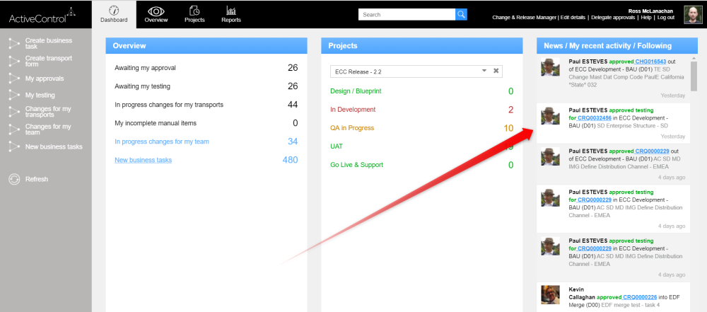 It is possible to view recent activity within the Web UI (approvals, rejections, testing etc) via the pane on the right hand side of the Web UI, and also to follow Tasks, Transports and SAP Objects that you are interested in.