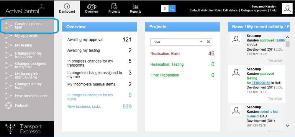 It is possible to create new Business Tasks in the ActiveControl Web UI via the Create Business Task option. Only authorised users will be able to perform this particular action.