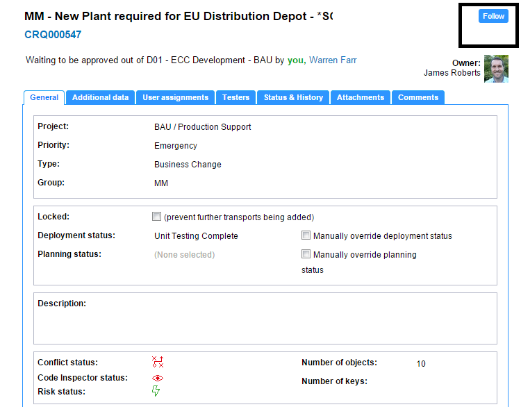Within the Web UI, it is possible to follow Business Tasks, Transports or SAP Objects that are of specific interest to you.
