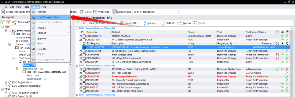 This can be done by highlighting the required transports and using the Lock option (or Unlock to remove the lock) via the Actions dropdown, or by choosing the same option via right-mouse click menu.