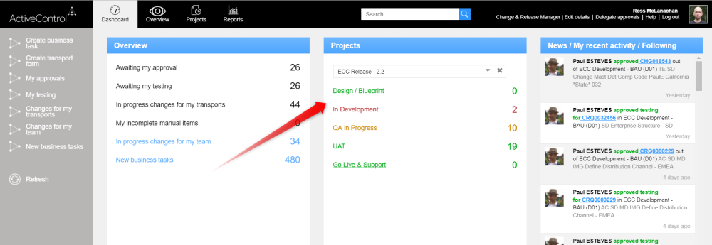 Project RAG statuses can be viewed via the Projects pane in the middle of the ActiveControl Web UI dashboard.