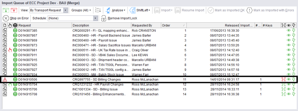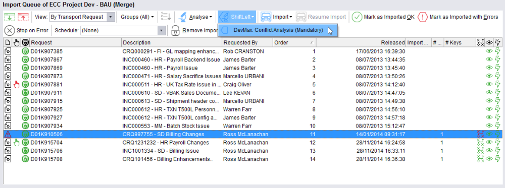 As soon as transports are moved into the inbox or import queue of a target specified as a merge target a conflict analysis check should be carried out to determine whether any of the objects on this transport have also been changed in the target system.