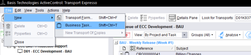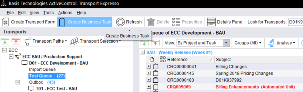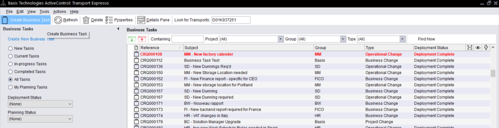 Business Tasks can be searched for within Transport Form screen via Related Business Tasks pane: