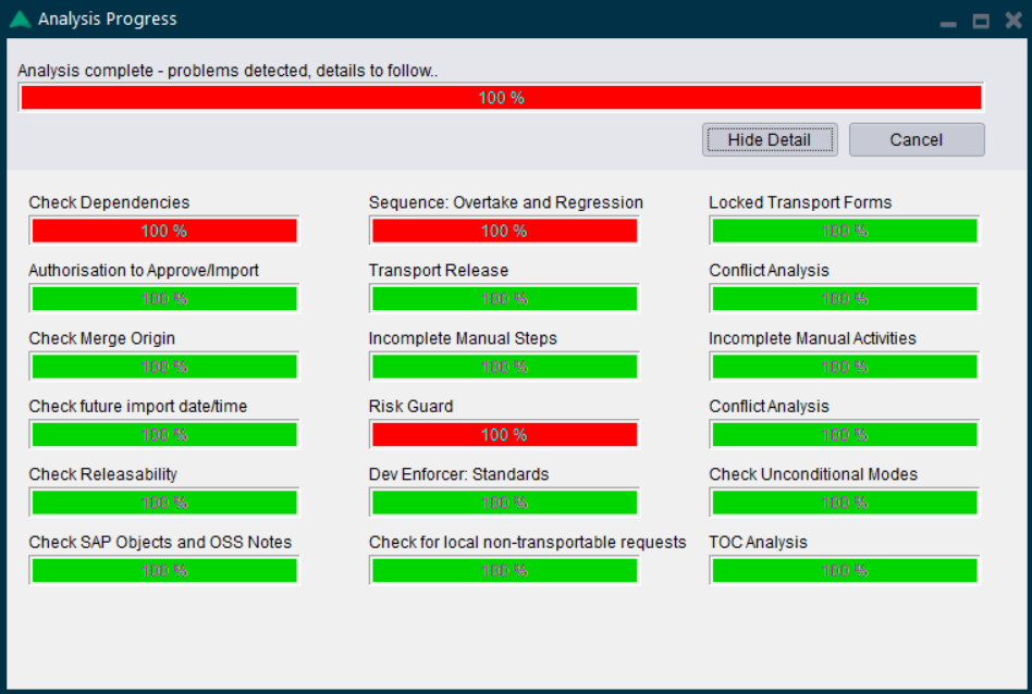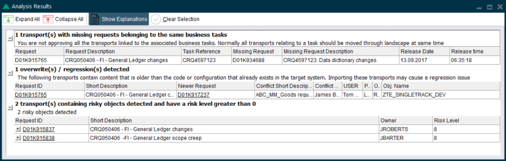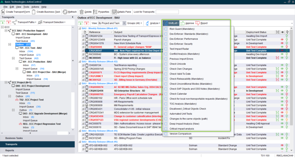 Prior to approval or import, the tasks/transports can be analysed using the Analyse button. First highlight the items to be analysed or use CTRL-A to select all. Individual ShiftLeft analyses can be run one by one via the ShiftLeft dropdown, or the General Analysis can be run to check all the General Analysers plus any mandatory ShiftLeft analysers in one step.