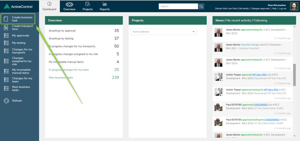 It is possible to create new Business Tasks in the ActiveControl Web UI via the Create Business Task option.