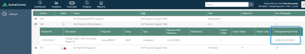 An “Anticipated Import Time” field can be viewed in the WebUI to see when Transports are expected to be deployed.