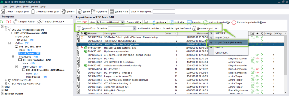 - Switch on or off ActiveControl as the mechanism for importing transports, using the [Scheduled by ActiveControl] option. When this button is highlighted, it means any assigned Import Schedules are active. If it is not highlighted, it means the Import Schedules are not active, regardless if they are assigned to the Import Queue.