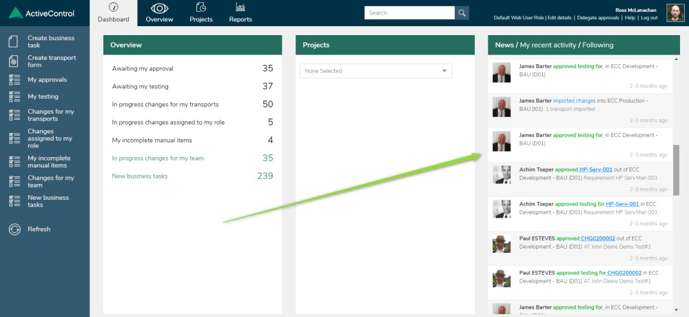 Within the ActiveControl Web UI, it is possible to view recent activity such as Approvals, Rejections and Imports via the pane on the right-hand side of the Web UI