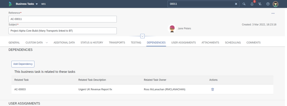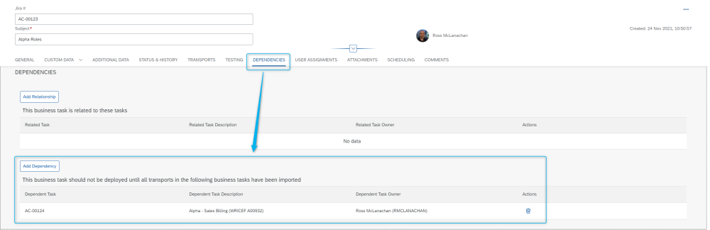 It is also possible to set Relationships at a Business Task level, for the scenario where there might not be a specific technical dependency, but where the Customer wanted to ensure that certain SAP changes moved at the same time. This was added as part of ActiveControl 8.50
