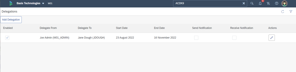 On the Delegation screen, an Approver can define their delegatees, as well as the start/end date period during which the defined delegatees will be able to perform their Approvals.