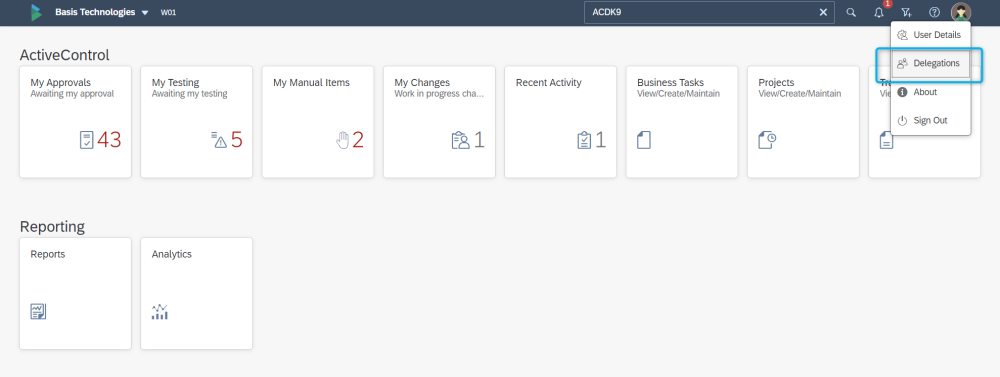 Figure: Delegates are set via the Delegations option in the User Actions Menu