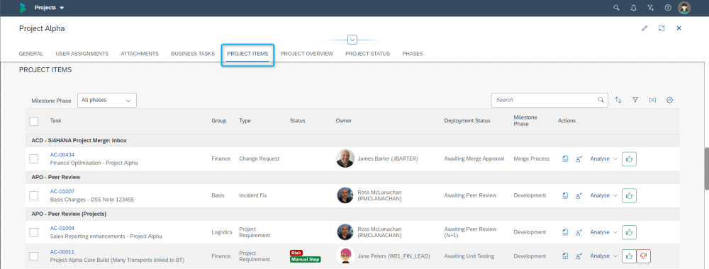 This screen shows all the in-progress Business Tasks against the Project, and also allows users with the appropriate authorisations/responsibility to be able to perform the corresponding Actions for the changes sitting in particular control point locations.