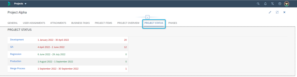 A Project Status subscreen is seen on the Project screen, to show progress of the underlying Business Tasks and Transport Forms based on their location, against the defined milestone Phase dates.