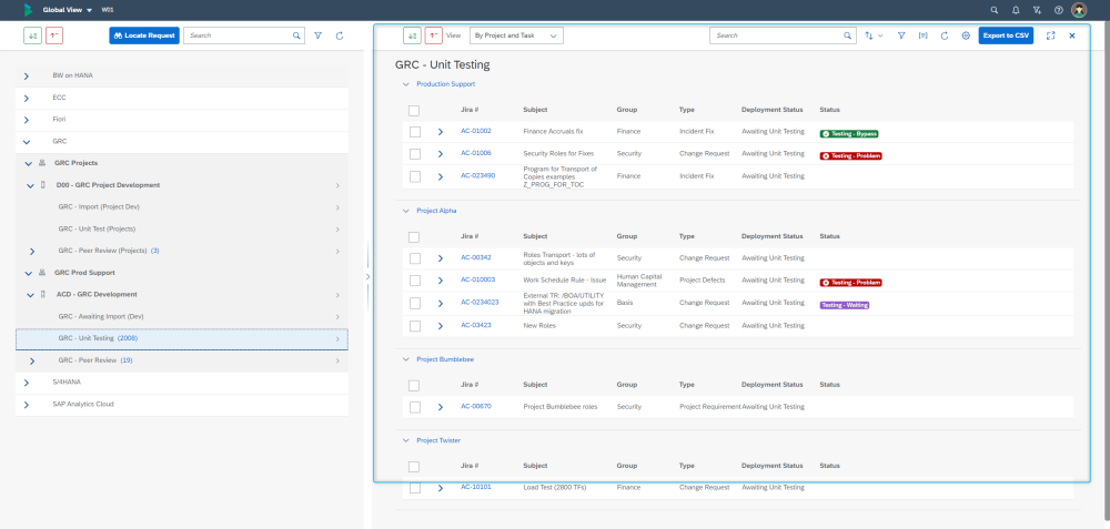 On the right hand side of the Global View is the main screen, via which all Projects, Business Tasks and Transports relating to SAP change currently sitting in a particular location can be seen.