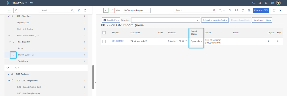 Any System Error will be indicated in the Global View via a red exclamation mark icon against the Import Queue.