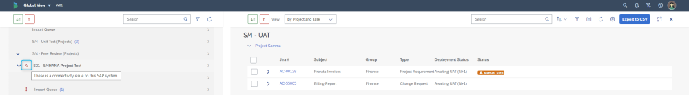 If there is an RFC connectivity issue between the ActiveControl Domain Controller and the managed satellite system, it will be indicated in the Global View via a red connection icon against the Target.