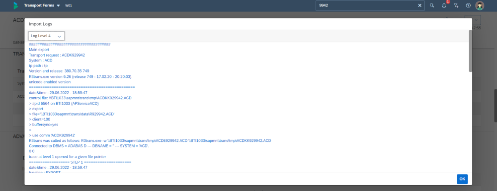Clicking on the icons allows the user to see more detailed SAP transport log information.