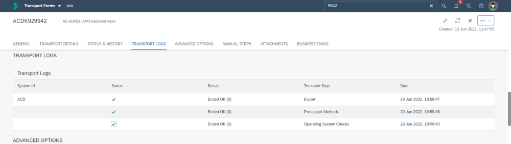 The Transport Logs subscreen within a Transport Form is a read-only screen showing the underlying SAP transport logs for the Transport.