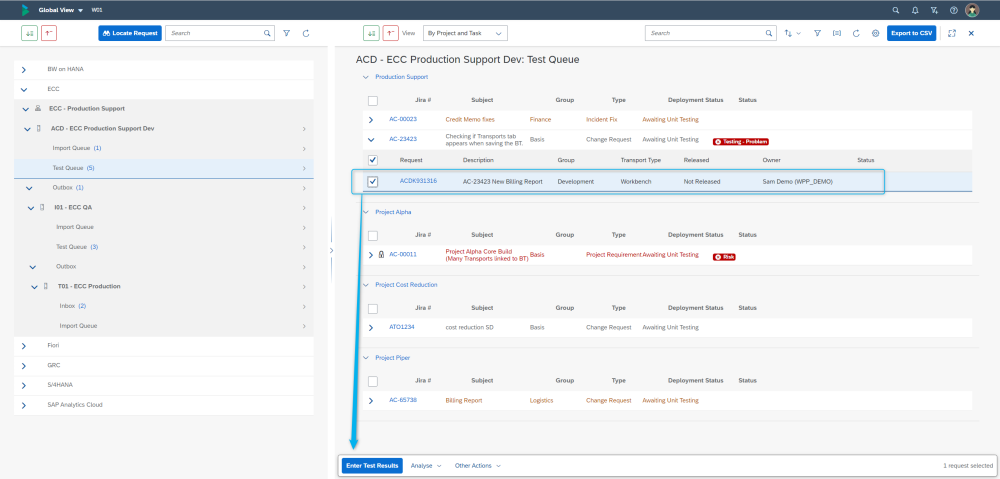 Transport level Test Queue signoffs can be done via both the My Testing app (by selecting only the desired transport(s) in the Enter Test Results screen, or alternatively via the Global View.