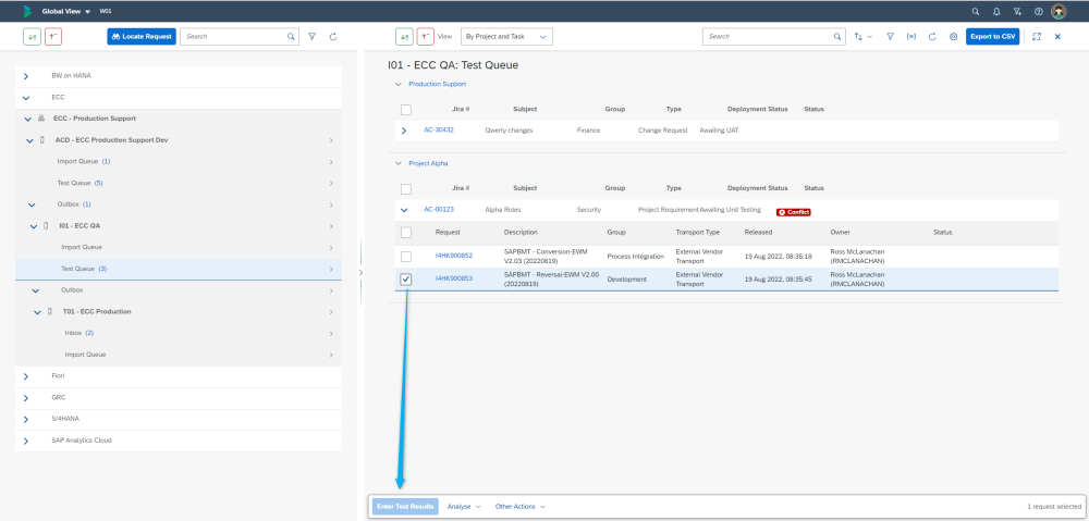 Figure: The Enter Test Results button will be greyed out if Transport level Testing has not been enabled for a particular Target test queue.