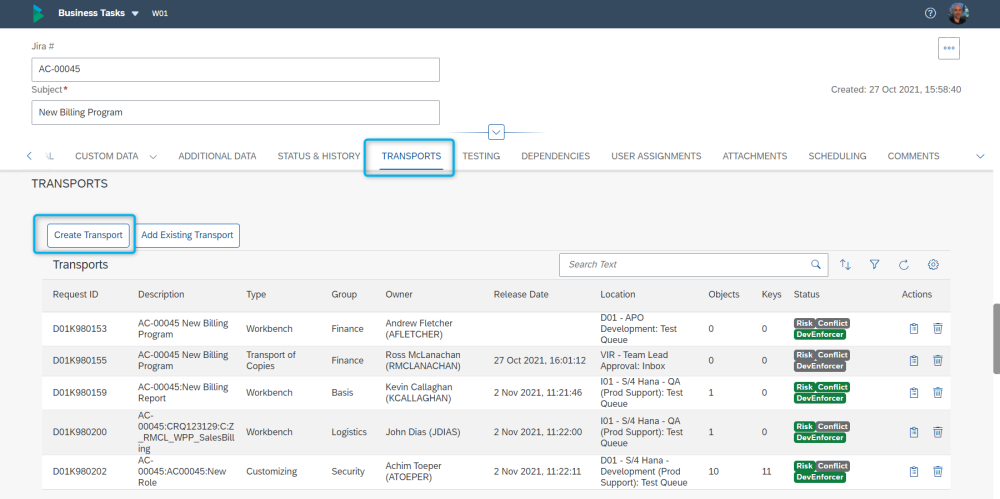 SAP Transports can be created in the Web Platform by authorised users via the [Create Transport] button on Business Task ‘Transports’ subscreen.