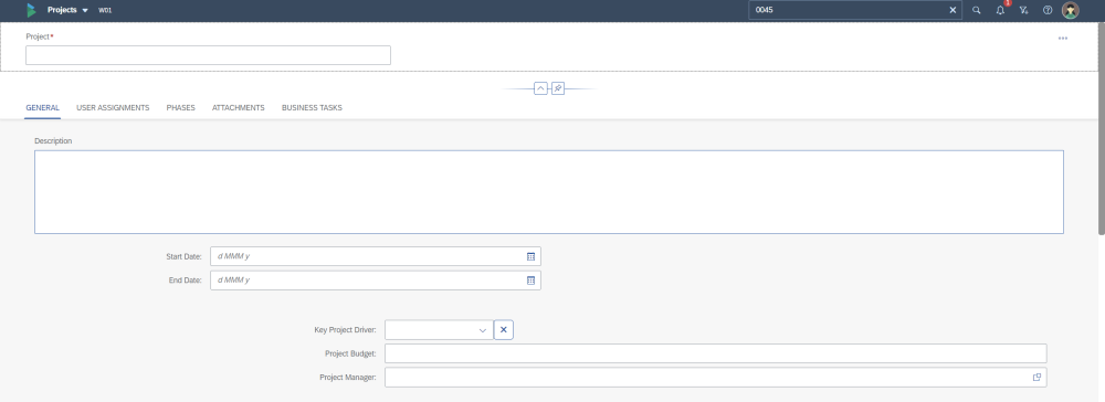 The new Project must be given a Project Name, via the field in the header portion of the screen. This is a mandatory field, and is indicated by a red asterisk.