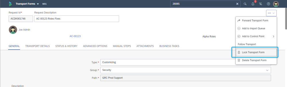 Locking is performed by authorised users via the Lock Transport Form option available via the ‘Three Dots’ dropdown in an individual Transport Form.