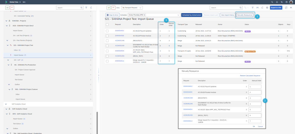 ActiveControl 9.10 introduced a new Manual Resequence capability for the customers that want to avoid the need for custom fields. This can be done via authorised users in the Global View, via the Manual Resequence button available in an Import Queue.