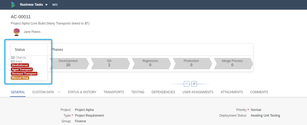 Indicates if a Transport has an incomplete Manual Step against it. Red means the Manual Step is incomplete and is holding up an import. Amber means the Manual Step is incomplete but is not holding up an Import. Green means that the Manual Step is complete (for the current system). | No configuration required. Please refer to this online Knowledge Article for further information on this RAG icon. |